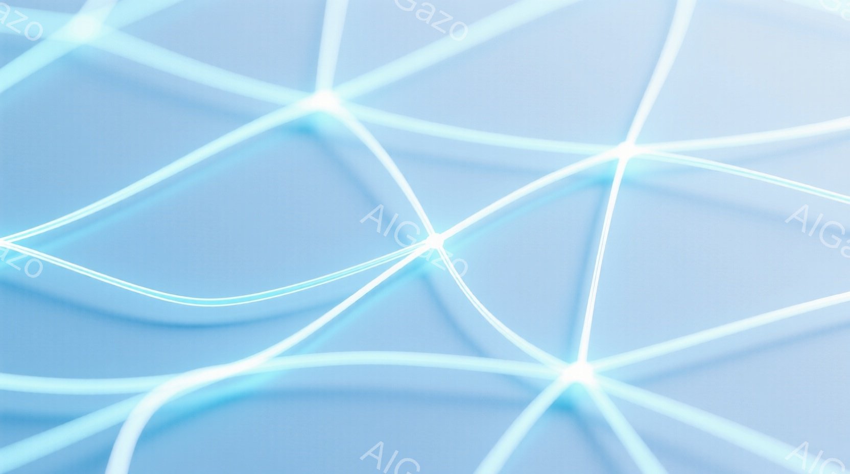 鮮やかな水色の背景に、白く光る線が複雑に交差している抽象的なイメージです。点在する白い光の粒子が、幻想的な空間をさらに強調しています。全体的に、未来的なテクノロジーやエネルギーの流れを連想させる、神秘的でクールな雰囲気です。