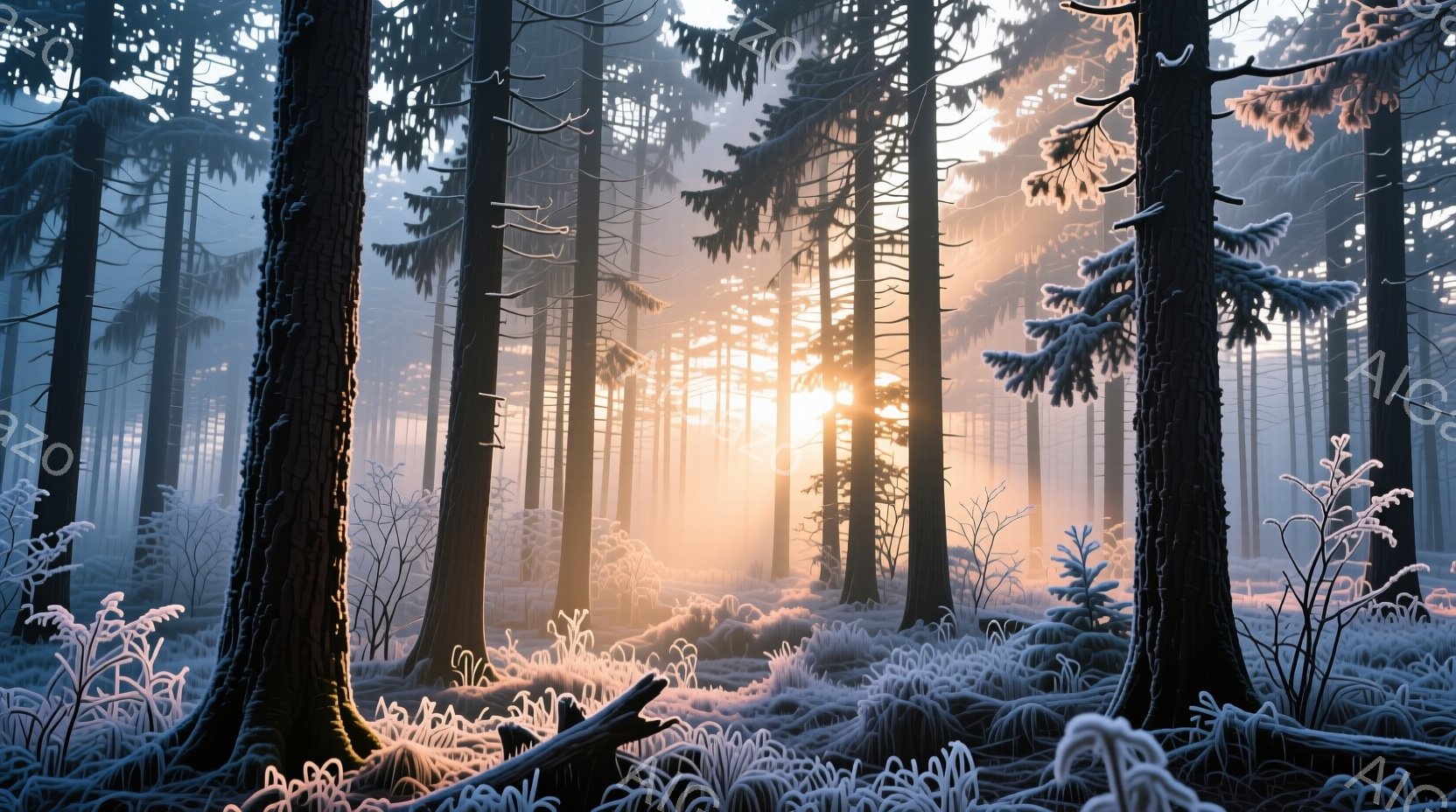 針葉樹の深い森が、朝日の光線によって幻想的に照らされている。地面や木の枝は霜で覆われ、白く輝き、冬の冷たさと静寂が感じられる。遠くに見える木々は霞んでおり、神秘的な雰囲気を醸し出している。