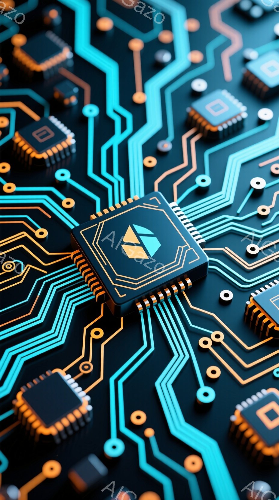 この画像は、回路基板をクローズアップしたもので、鮮やかなターコイズブルーとオレンジ色の線が複雑に絡み合って構成されています。中央には、金色の縁取りがされた大きなチップが配置され、周囲には様々な電子部品が規則的に配置されています。全体的に未来的な印象を与え、テクノロジーと精密さを強調しています。