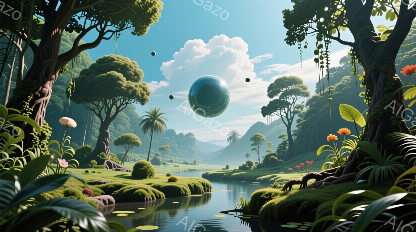 この無料AI生成画像「鬱蒼とした緑の森の中に、穏やかな水面が広がる光景です。巨大な月が空に浮かび、周囲には色彩豊かな球体が点在し、幻想的な雰囲気を醸し出しています。水面には睡蓮が咲き、周囲の木々や草木が水面に映り込み、静かで神秘的な空間を作り出しています。」は、2025年10月22日に作成されました。 サイズは 1664×928px の高解像度で、商用利用も可能なフリー素材として提供しています。