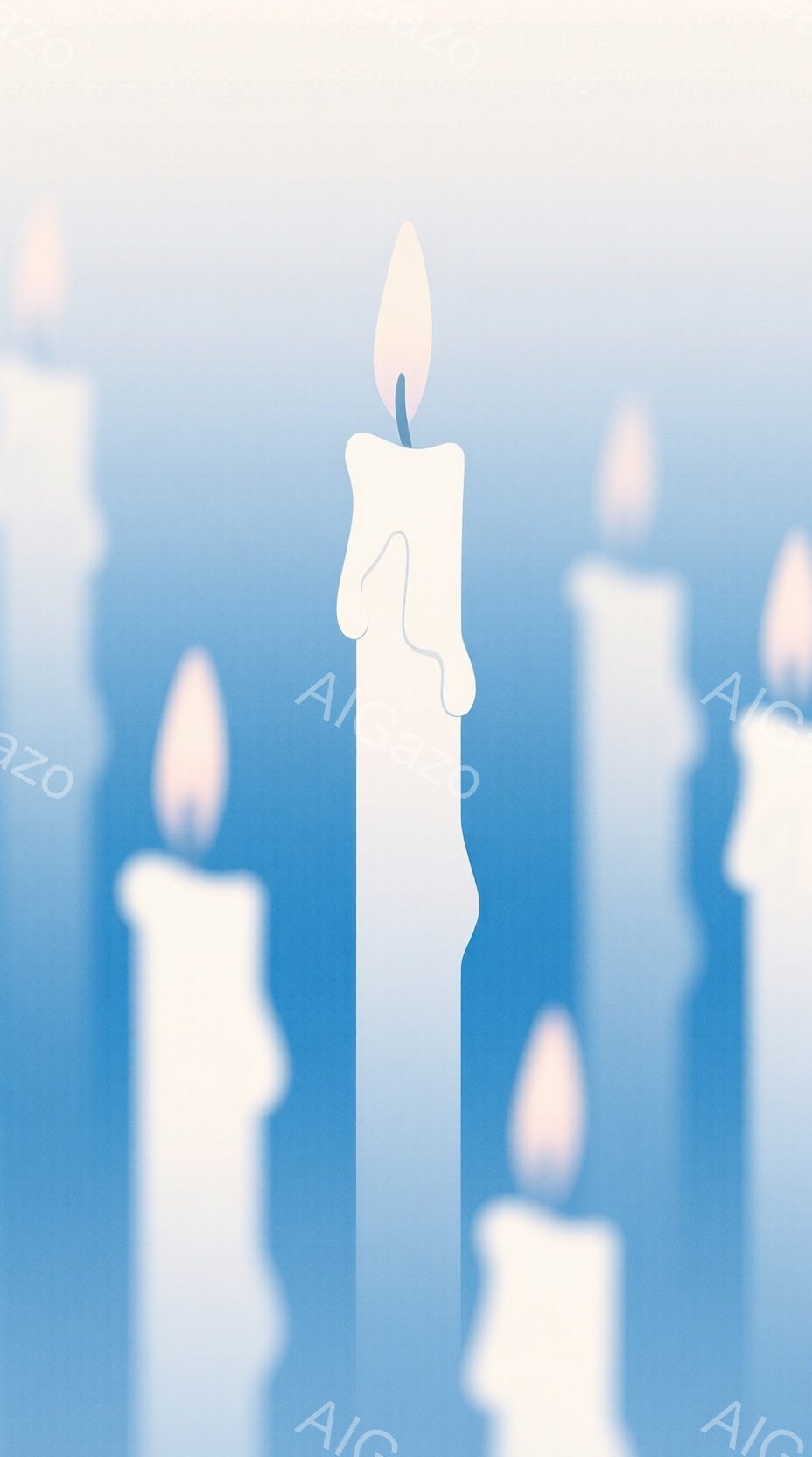 白い背景に、数本のろうそくがぼんやりと描かれています。中央のろうそくは他のものより高く、詳細な燭台の上に立っており、明るい炎が灯っています。全体的に、幻想的で穏やかな雰囲気であり、ぼかし効果によって神秘的な印象を与えています。