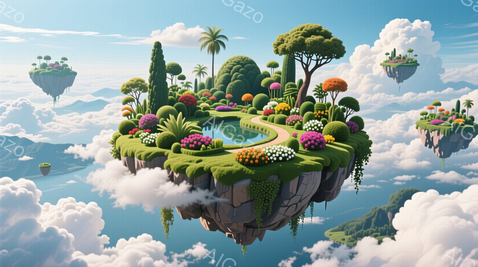 空中に浮かぶ緑豊かな島が印象的な画像です。島には円形の池があり、周囲には色とりどりの花や植物が生い茂り、可愛らしい家が建っています。背景には雲海が広がり、遠くには山脈が見え、まるで夢の中のような幻想的な雰囲気を醸し出しています。