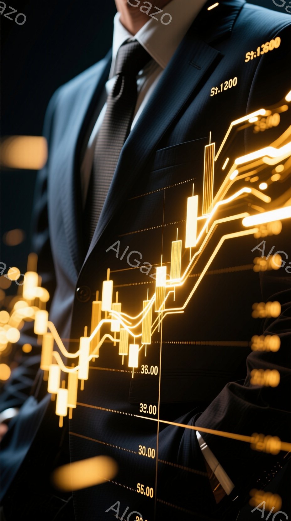 ダークグレーのスーツにネクタイを締め、髪は短く整えられた男性が写っている。背景には、光の線で表現された上昇傾向の株価チャートが、まるで都市の夜景のように広がっている。全体的に、金融市場の活気と成功を象徴するような、洗練された雰囲気の画像である。