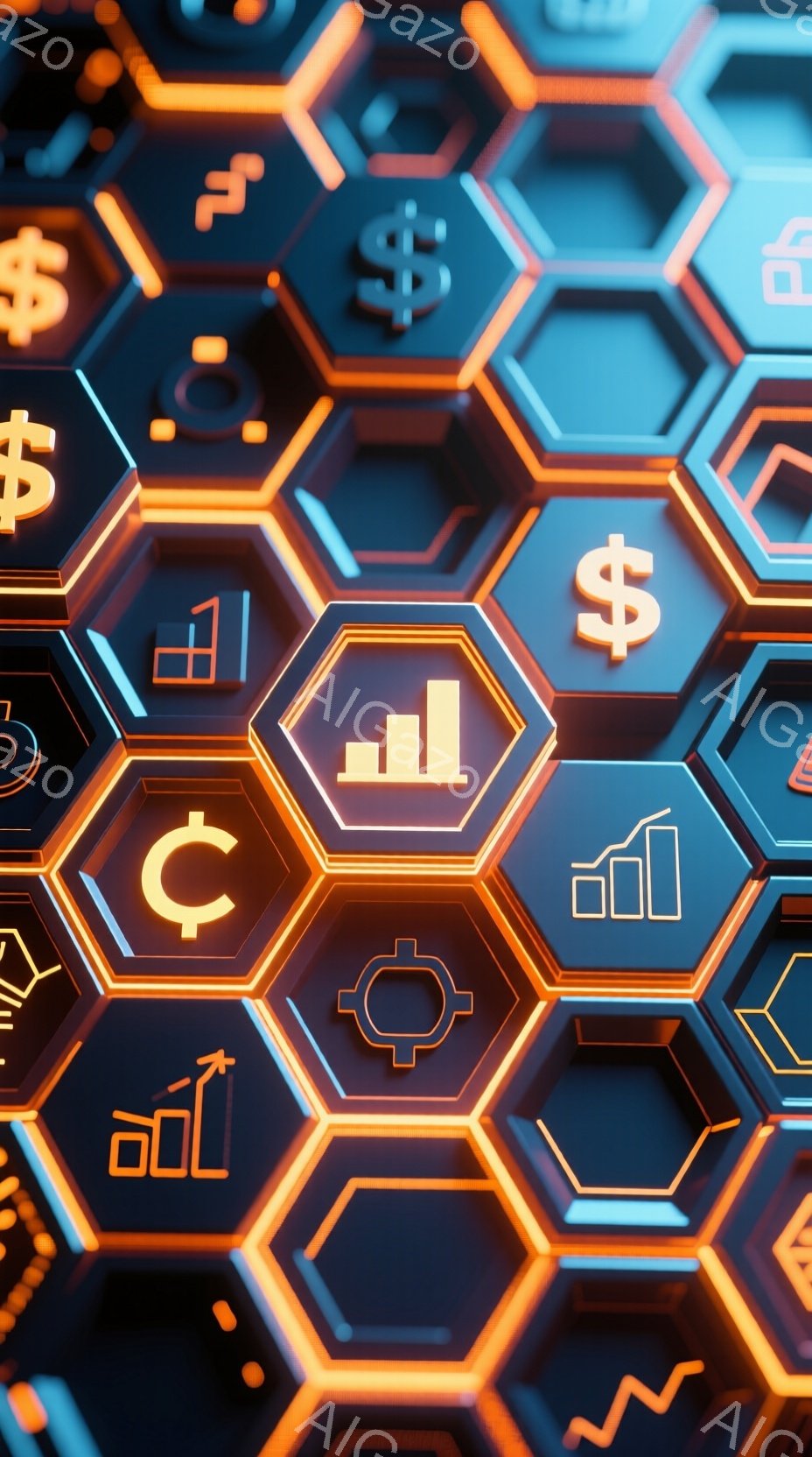画像は、様々なアイコンが配置された六角形のグリッドパターンで構成されています。ドル記号、グラフ、家、ビットコインの記号などが鮮やかなネオンカラーで強調されており、暗い背景の中で光を放っています。全体的に、テクノロジー、金融、未来的な雰囲気を感じさせる抽象的なデザインです。