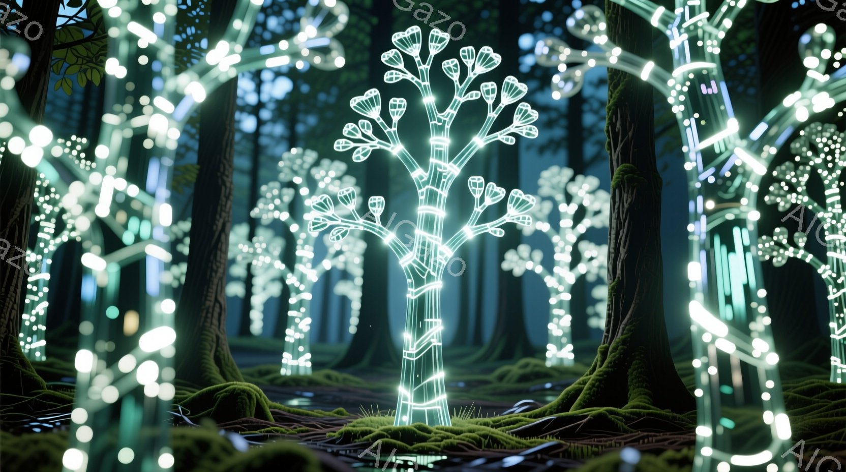 鮮やかなネオンブルーで描かれた幻想的な森林が広がっている。木々は幾何学的な線で構成され、まるで発光する回路のように見える。地面は緑の苔に覆われ、薄暗い光の中で神秘的な雰囲気を醸し出している。
