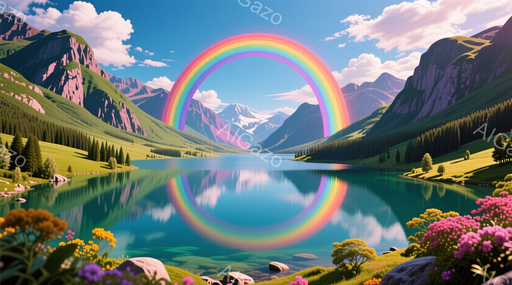 雄大な山々に囲まれた湖に、鮮やかな虹がかかっています。湖面は穏やかで、周囲の緑豊かな風景と虹の色を美しく映し出しています。全体的に穏やかで平和な雰囲気で、自然の壮大さと美しさを感じさせます。