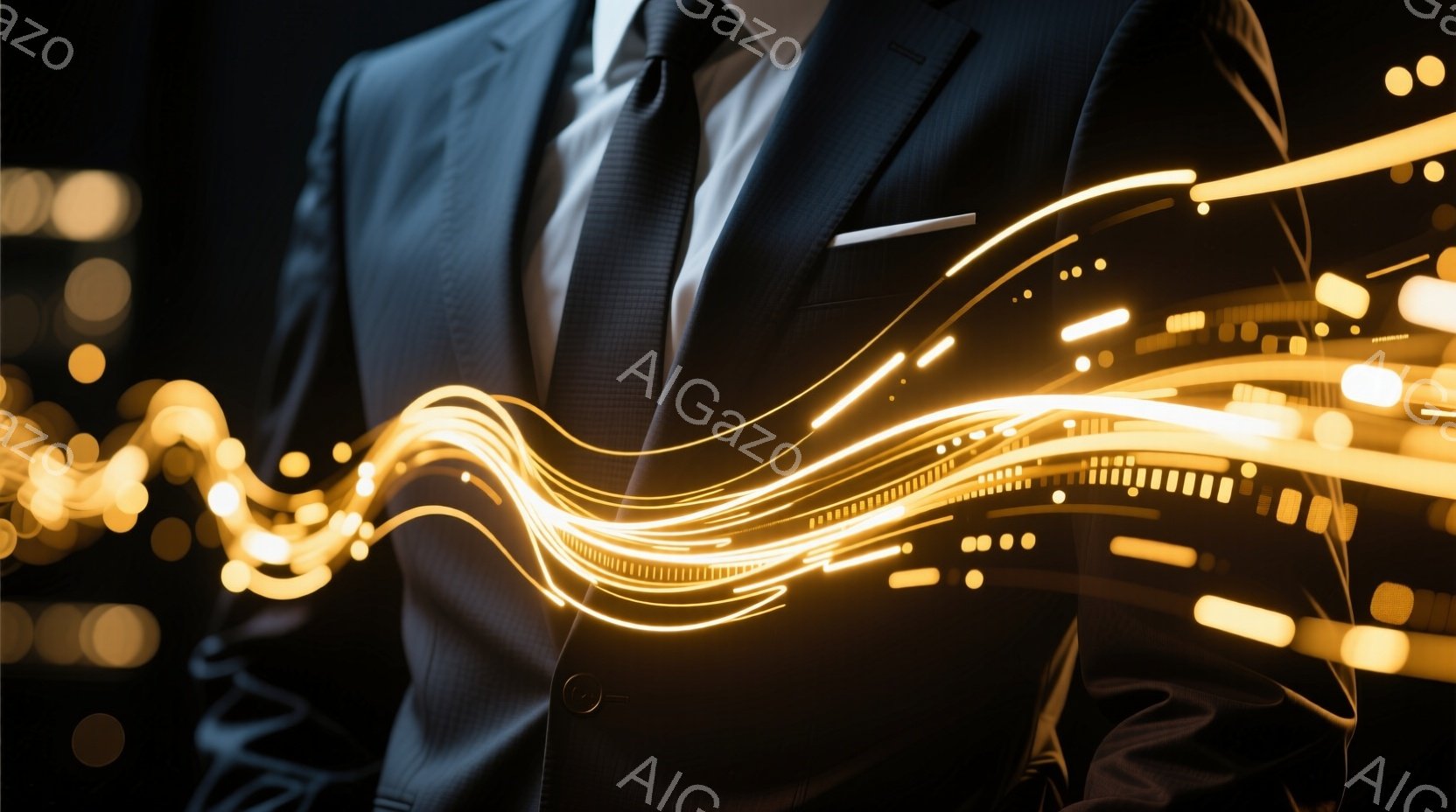 暗い背景に黒いスーツ姿の男性が映っており、まるで光の線が彼の周りを包み込んでいるかのように見える。光線は、街の夜景を思わせるぼやけた黄色い線で構成され、動きやエネルギーを感じさせる。全体的に、未来的な雰囲気と、男性の力強さや自信を強調するような印象を与える。