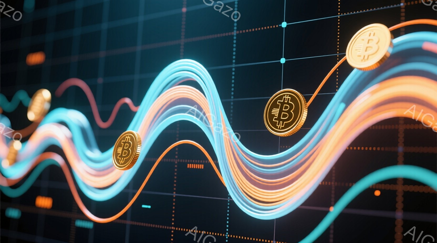 鮮やかなネオンカラーの線が渦巻き状に絡み合い、背景には株価チャートのようなグラフが表示されています。その中心には金色のビットコインが二つ浮かんでおり、現代金融とテクノロジーの融合を象徴するような印象を与えます。全体的に未来的な雰囲気で、ダイナミックかつ活気のあるイメージです。