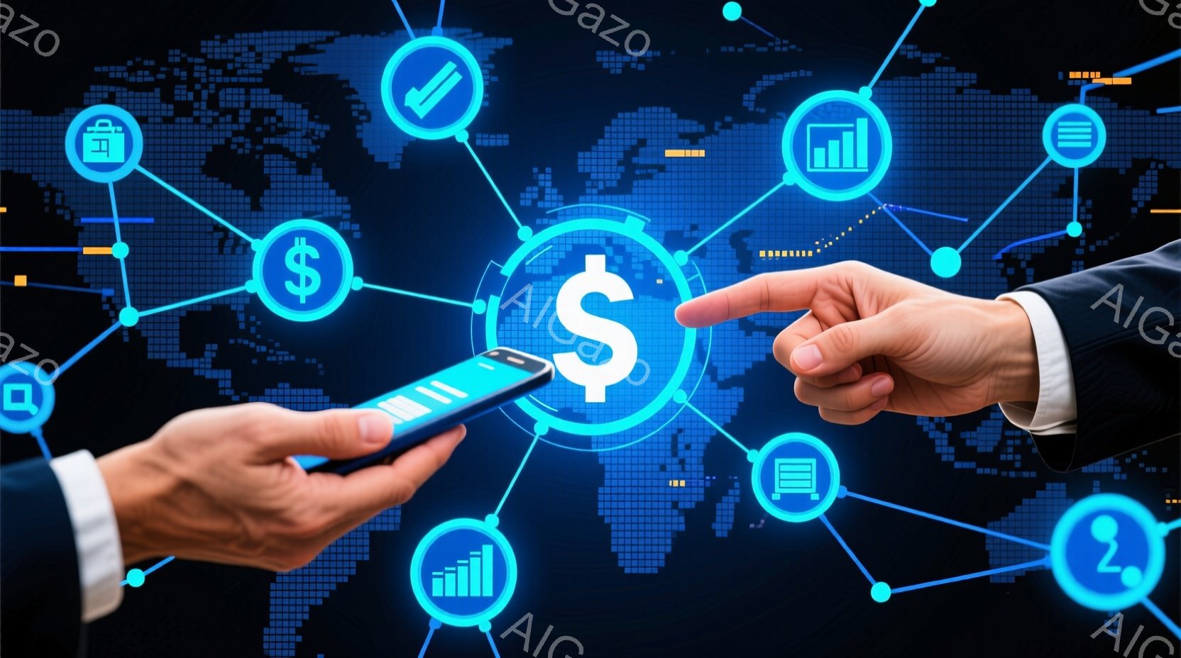 この画像は、ビジネススーツを着た二人の人物がスマートフォンを互いに向けて持っている様子が写っています。スマートフォンの画面には様々なアイコンが表示されており、中心にはドル記号が輝いています。背景は夜景のようなぼやけた光で、全体的に未来的な金融技術を連想させる雰囲気が漂っています。