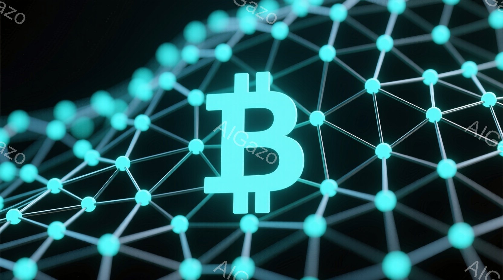 暗い背景に、明るい青色の線で構成されたネットワークが広がっています。ネットワークの中心には、ビットコインの記号が強調されており、それが光り輝いています。全体的に、テクノロジー、金融、そして接続性を暗示する、未来的で洗練された雰囲気です。