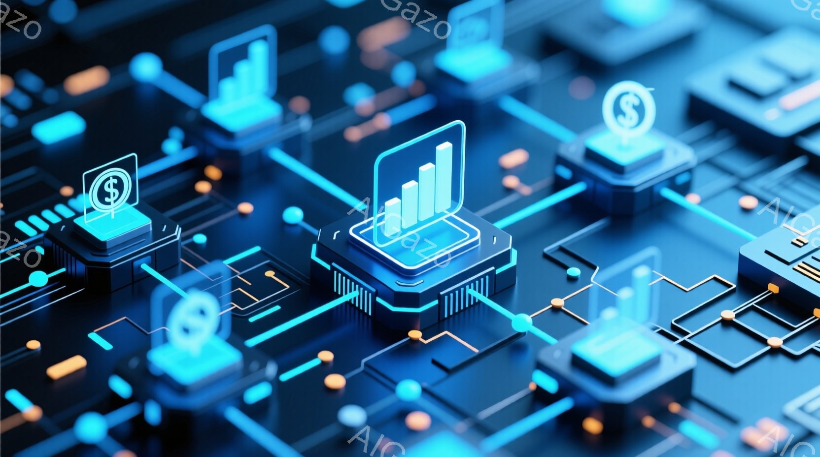 この画像は、青を基調とした未来的な回路基板の描写です。各接続点には、棒グラフとドル記号を表示するホログラフィックなディスプレイが配置されており、金融やデータ分析を連想させます。全体的に、高度なテクノロジーと経済活動のつながりを表現した、クールで洗練された雰囲気です。