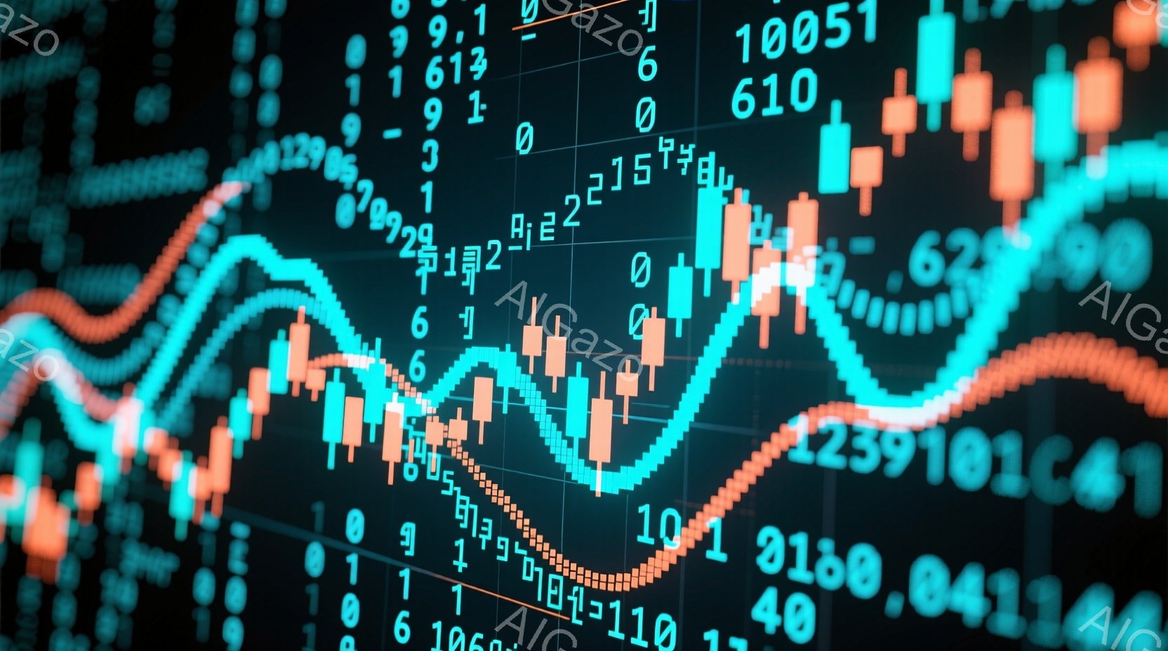 この画像は、未来的な都市景観の3Dイラストです。幾何学的な形の建物が配置され、緑、赤、青などの鮮やかな色彩が使われています。背景には、株価チャートのような線グラフが描かれ、全体的にテクノロジーと金融をテーマにしたデザインとなっています。
