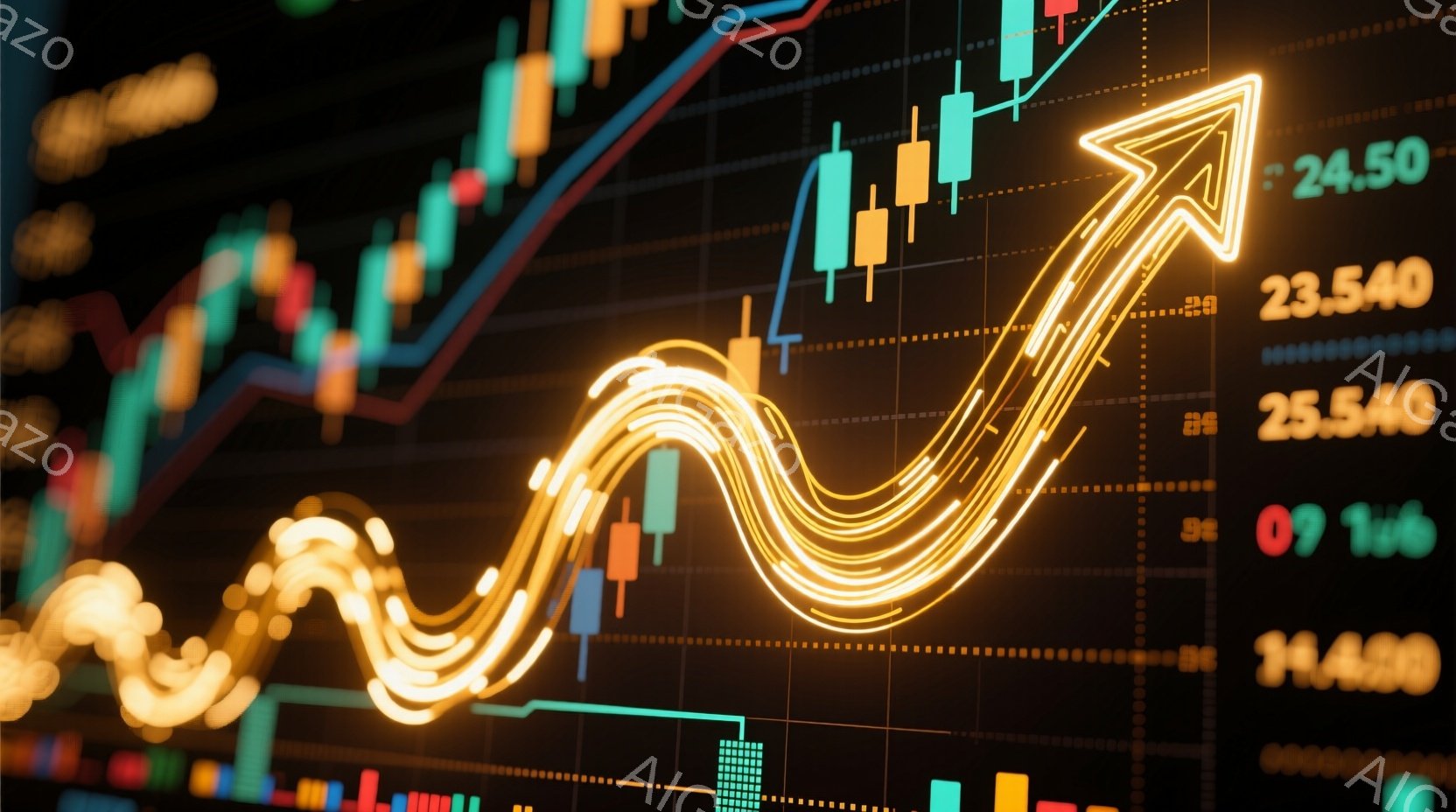 グラフが背景に表示されており、明るいオレンジ色の線が上昇傾向を示しています。バーグラフは様々な高さで、緑、赤、青の色合いで描かれ、金融市場やデータ分析の雰囲気を醸し出しています。全体的に、成長や成功を象徴する、ダイナミックで未来的な印象を与えます。
