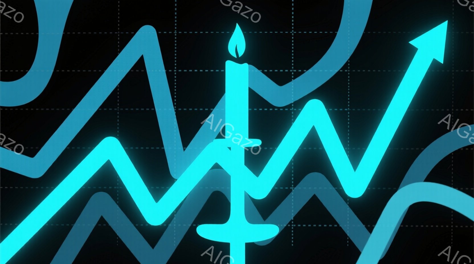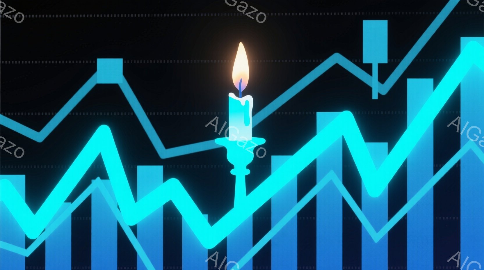 鮮やかな青色の背景に、シャンデリアのような燭台が配置されています。燭台には三本のロウソクが灯っており、それぞれが明るく輝いています。背景には、グラフのような波線が描かれており、全体的に未来的で抽象的な雰囲気を醸し出しています。