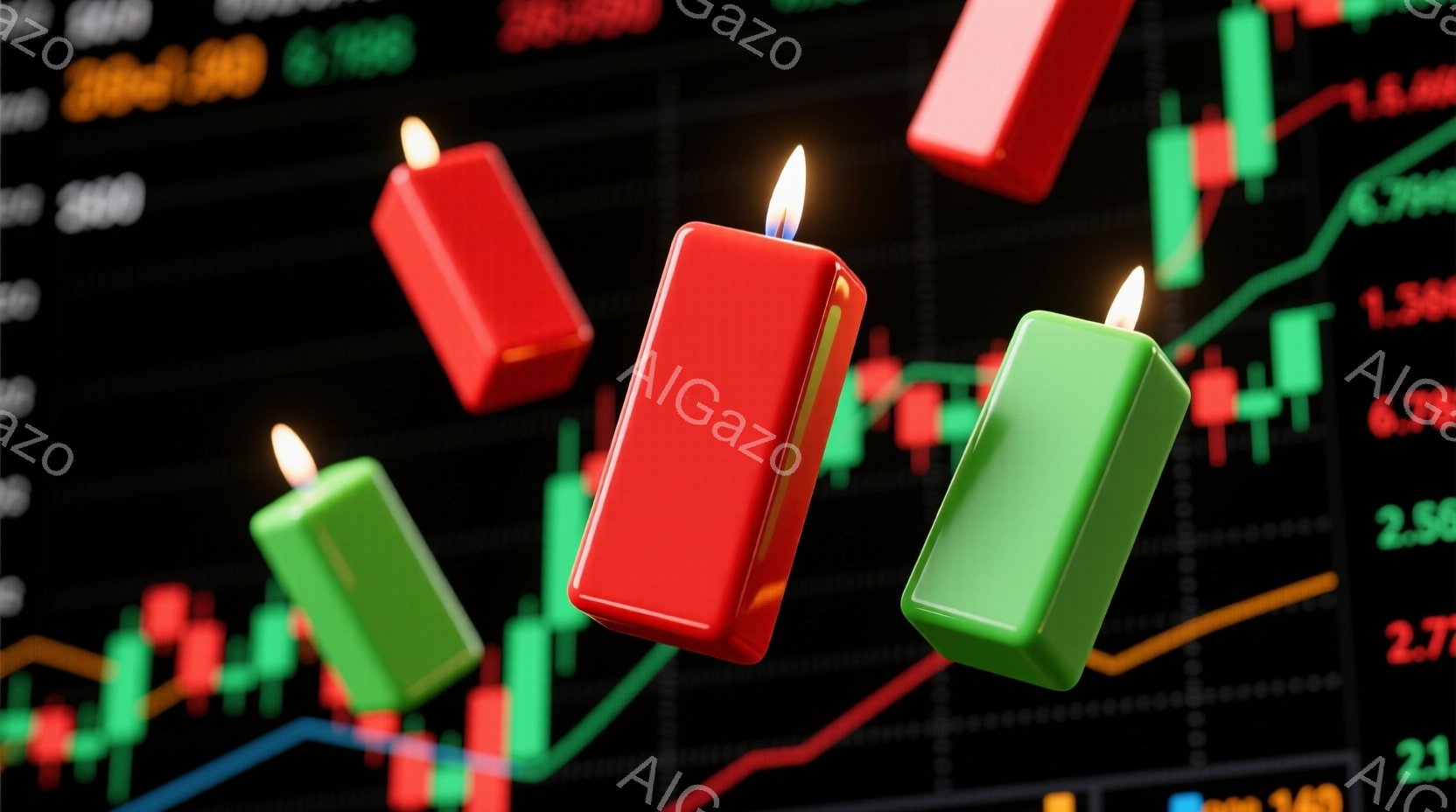 鮮やかな緑とピンクのキャンドルスティックチャートが、青色のグリッド背景に表示されています。チャートは、上昇と下降を繰り返す株価や為替レートなどの金融データを視覚的に表現しており、ピンク色の線がトレンドラインを示しています。全体として、市場の変動や投資の可能性を示す活気ある金融関連のイメージです。