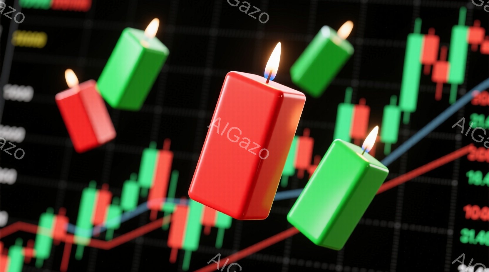 鮮やかな緑と赤のロウソクが、金融チャートを背景に空中に浮いています。チャートは上昇傾向の線と、価格変動を示す緑と赤の棒で構成されており、金融市場のダイナミックな動きを表現しています。 全体的に、投資や経済状況を視覚的に表現した、モダンでカラフルなイメージです。