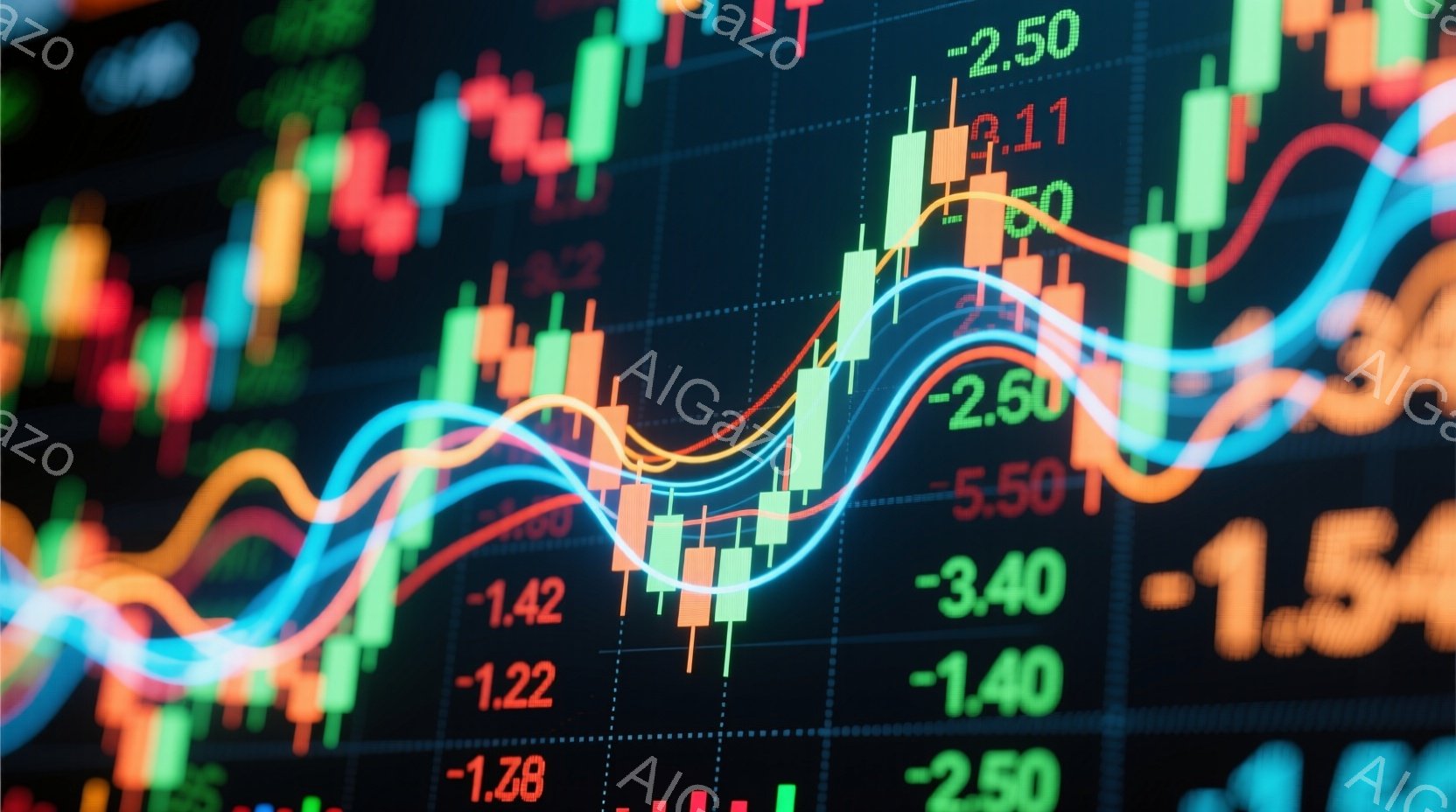 この画像は、株式市場のチャートとグラフを表現しており、緑と赤の柱状図が複雑に絡み合っています。白く輝く曲線がチャートの上を走り、活気のある金融市場のダイナミックな動きを示唆しています。背景は暗く、数字が散りばめられ、専門的で緊張感のある雰囲気を醸し出しています。