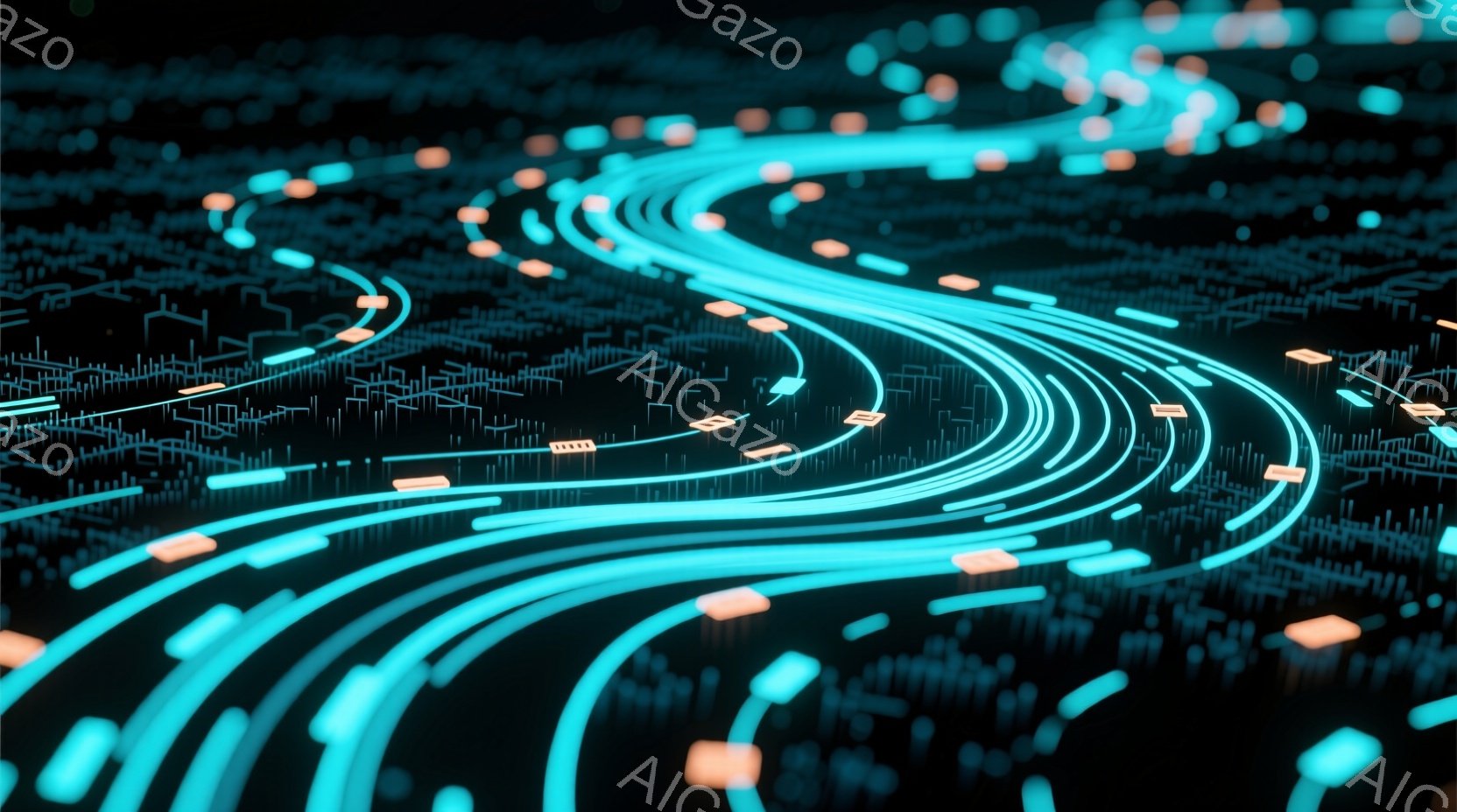 この画像は、青とオレンジの光る線が複雑に絡み合い、未来都市の回路図のような景観を表現しています。背景には、無数の小さな建物が配置され、まるで電子基板のようなテクスチャを作り出しています。全体的に、サイバーパンクやテクノロジーを連想させる、近未来的で没入感のある雰囲気です。