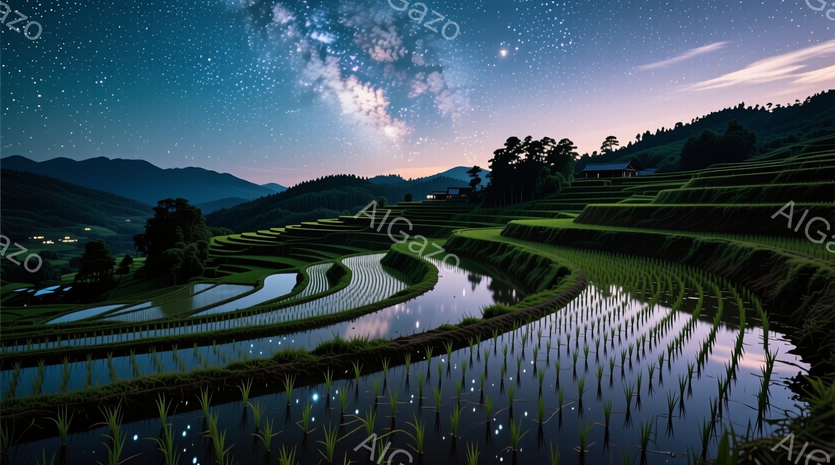 幾重にも重なる田んぼが、夜空の天の川を映し出す幻想的な風景です。水面に反射する星々が、田んぼの曲線と調和し、静寂で神秘的な雰囲気を醸し出しています。遠景には建物や緑豊かな山々がそびえ立ち、自然と人工の調和が感じられます。