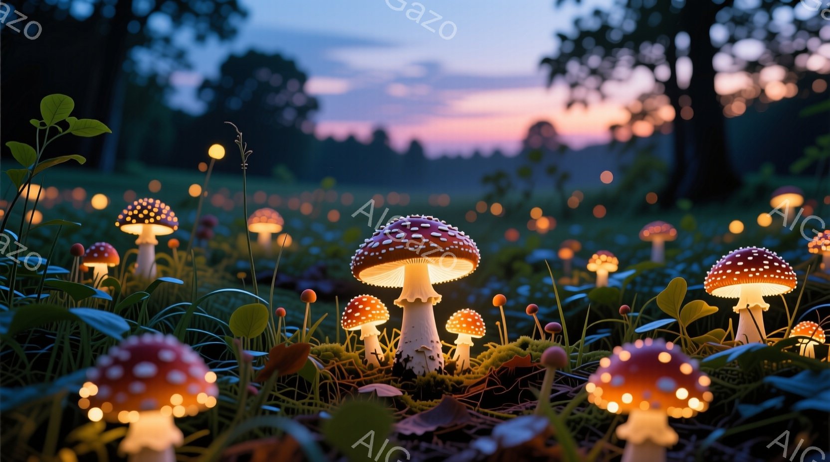 深い緑の草地に、様々な種類のキノコが点在し、まるで幻想的な森を思わせる光景です。キノコは赤、白、オレンジなどの色合いで、それぞれが柔らかな光を放ち、周囲を照らしています。背景には木々が立ち並び、夕暮れ時の空が美しいグラデーションを描き、静かで神秘的な雰囲気を醸し出しています。