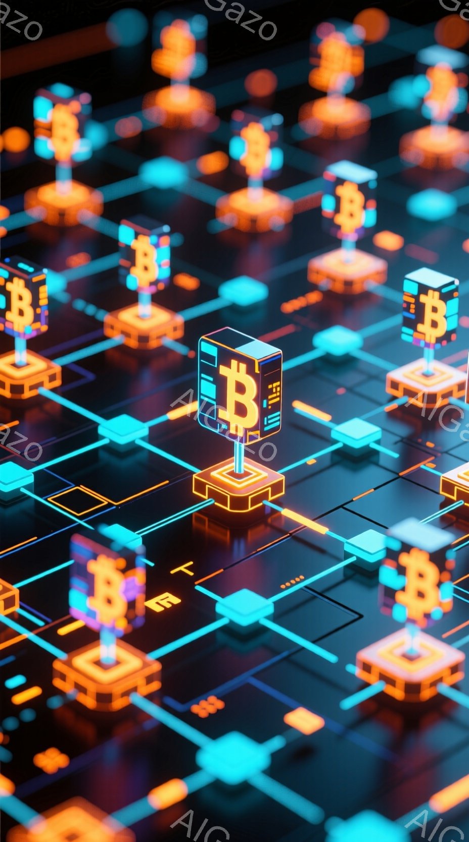 この画像は、暗い背景に配置された、未来的な配線と接続で構成されたネットワークを描いています。明るいオレンジと青色の光を発するビットコインのアイコンが、ネットワークの中心に配置され、他の多くの小さなアイコンと接続されています。全体的に、ハイテクでデジタルな雰囲気であり、ブロックチェーンや暗号通貨に関連する視覚的表現です。