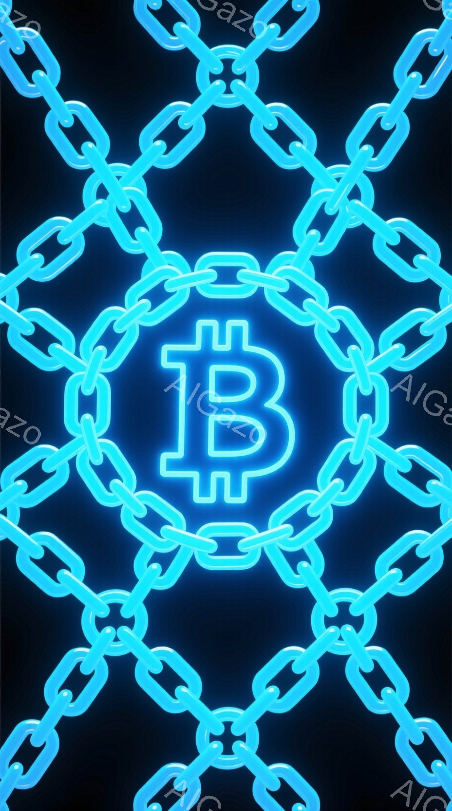 鮮やかな青色の鎖が円を描き、中心にはビットコインのシンボルがネオンライトのように光っています。背景は真っ暗で、鎖とシンボルが際立って見えます。全体として、暗号通貨のセキュリティとつながりを象徴するような、未来的でクールな雰囲気です。