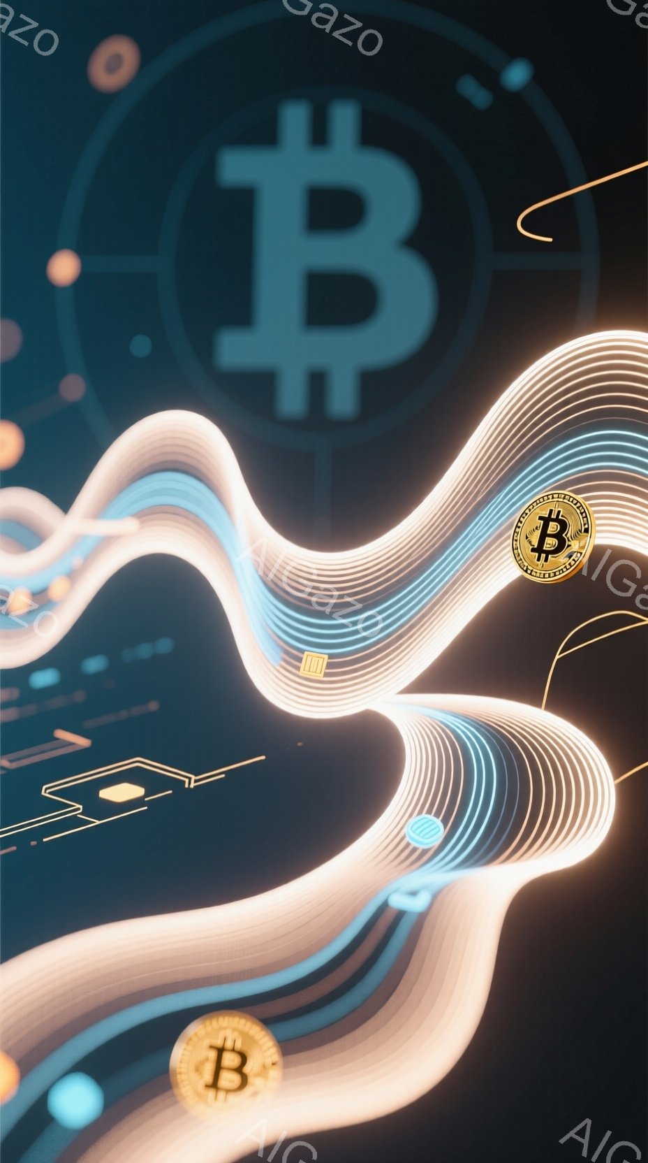 鮮やかな背景に、ビットコインのロゴが幾重にも重なり合う曲線的な帯が描かれています。帯は白から金色へと徐々に色が変化し、流れるような光沢を放っています。全体として、現代的で未来的な印象を与える抽象的なイメージです。