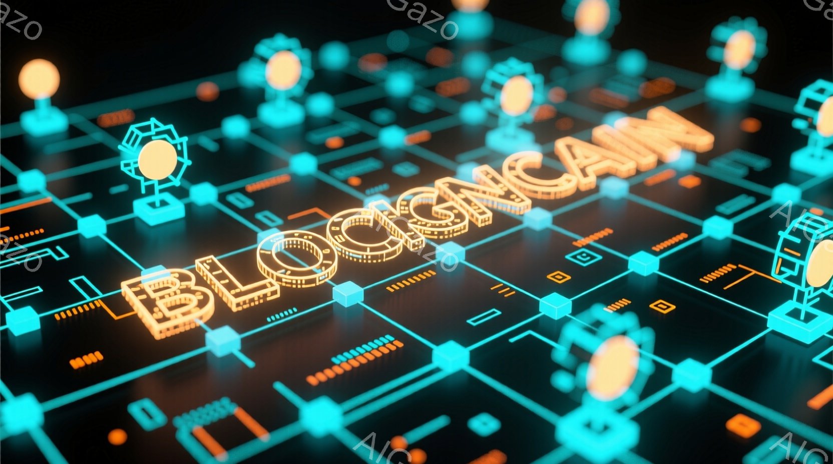 鮮やかなネオンブルーのグリッドが広がり、その交差点にオレンジ色のビットコインのアイコンが配置されています。グリッドは未来的な回路のようであり、暗い背景に浮かび上がっています。全体的に、技術革新と暗号通貨に関連付けられた、洗練されたデジタルな雰囲気を醸し出しています。