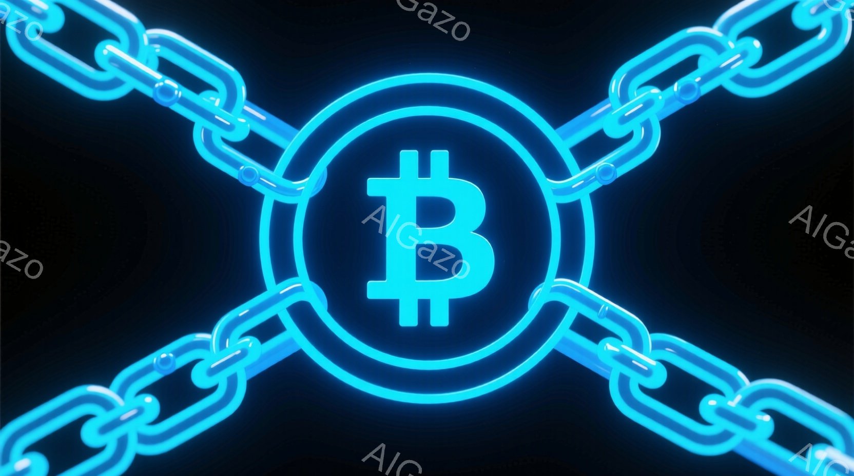 鮮やかな青色のネオンライトで構成されたビットコインのチェーンが描かれています。各リンクは円形で、中央にはビットコインのシンボルが配置されています。背景は暗く、星のような微細な光点が散りばめられており、未来的な雰囲気を醸し出しています。
