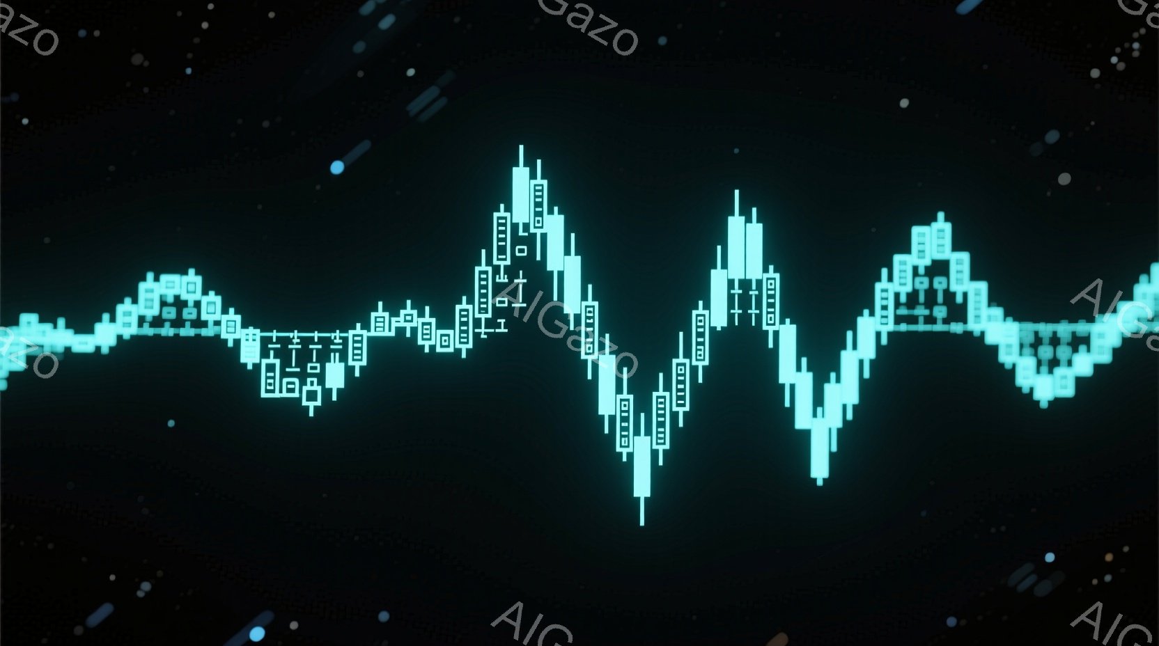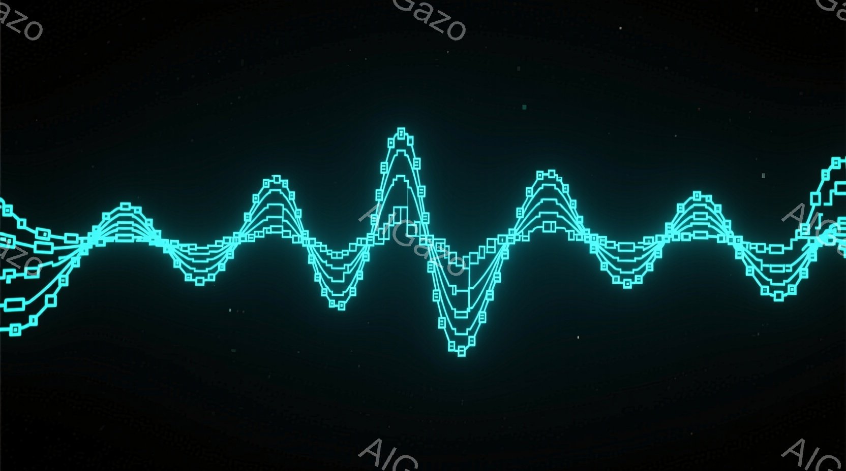 鮮やかなターコイズブルーのピクセル化された波形が、黒色の背景に大きく広がっています。波形は、まるで音響信号を視覚化したような形をしており、全体的に未来的な印象を与えます。背景は完全に暗く、波形が際立って見えています。