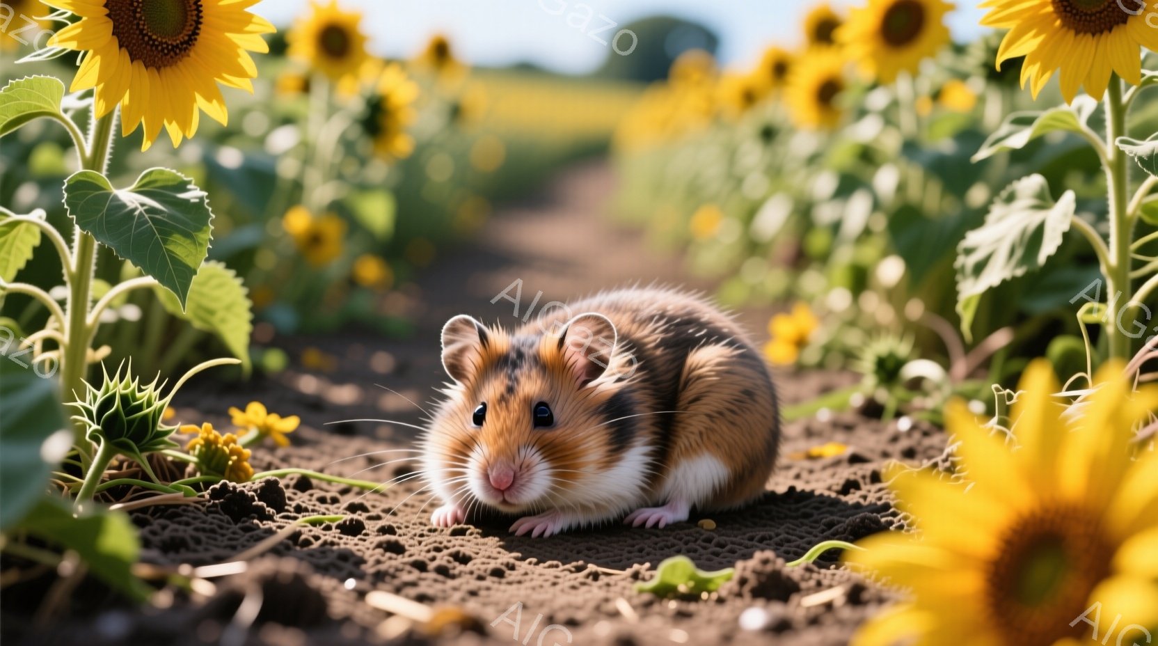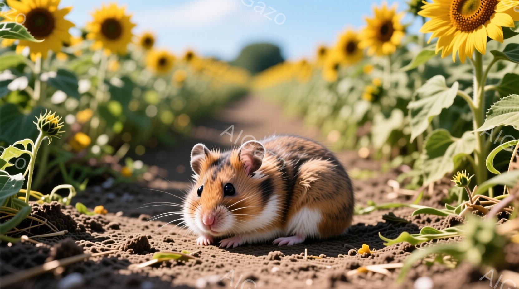 太陽の花畑の中央に、小さなハムスターが土の上に座っています。ハムスターは茶色と白の毛並みで、つぶらな瞳でカメラを見つめており、少し緊張した表情を浮かべています。背景には鮮やかな黄色いヒマワリが咲き乱れ、夏の穏やかな日差しが降り注ぎ、暖かく平和な雰囲気を醸し出しています。