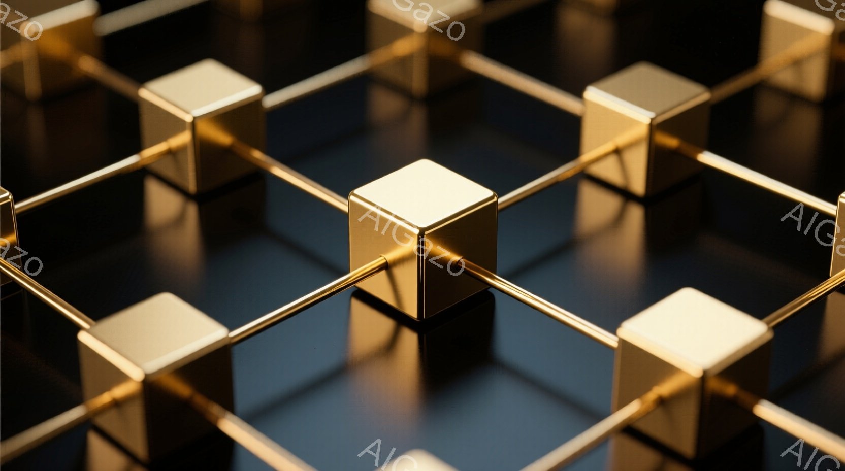 黄金色の立方体が黒い背景の上で複雑なネットワーク状に配置されています。それぞれの立方体は細い金色の棒で繋がれており、光沢があり、反射が映り込んでいます。全体的に、洗練された、抽象的で、幾何学的な構成が印象的です。