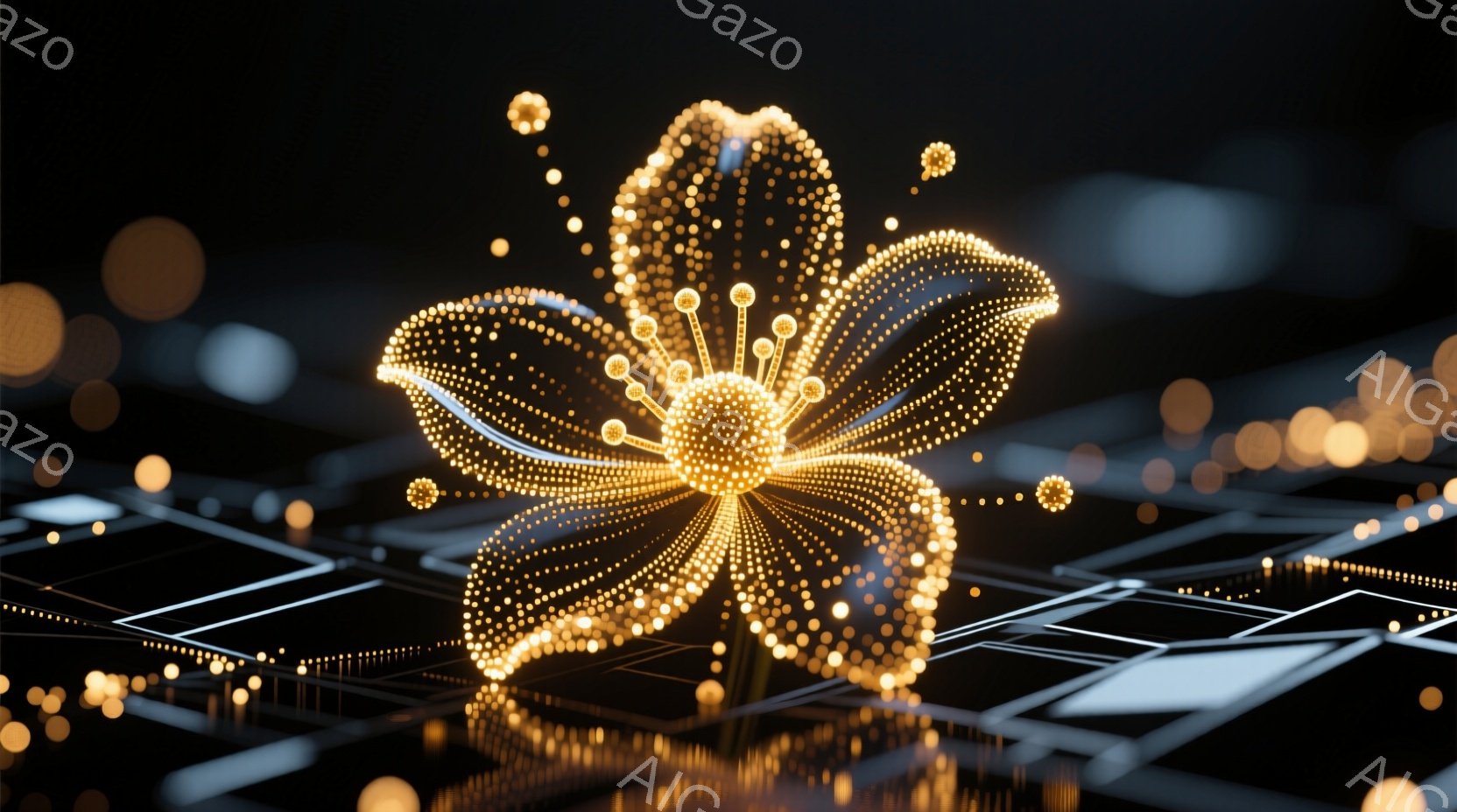 鮮やかな金色の光の粒子で構成された花が、黒色の電子回路のような背景に浮かび上がっています。花は、中心に向かって集まる光の筋で構成され、繊細で未来的な印象を与えます。背景には、ぼやけた光の粒子が散りばめられ、幻想的な雰囲気を醸し出しています。