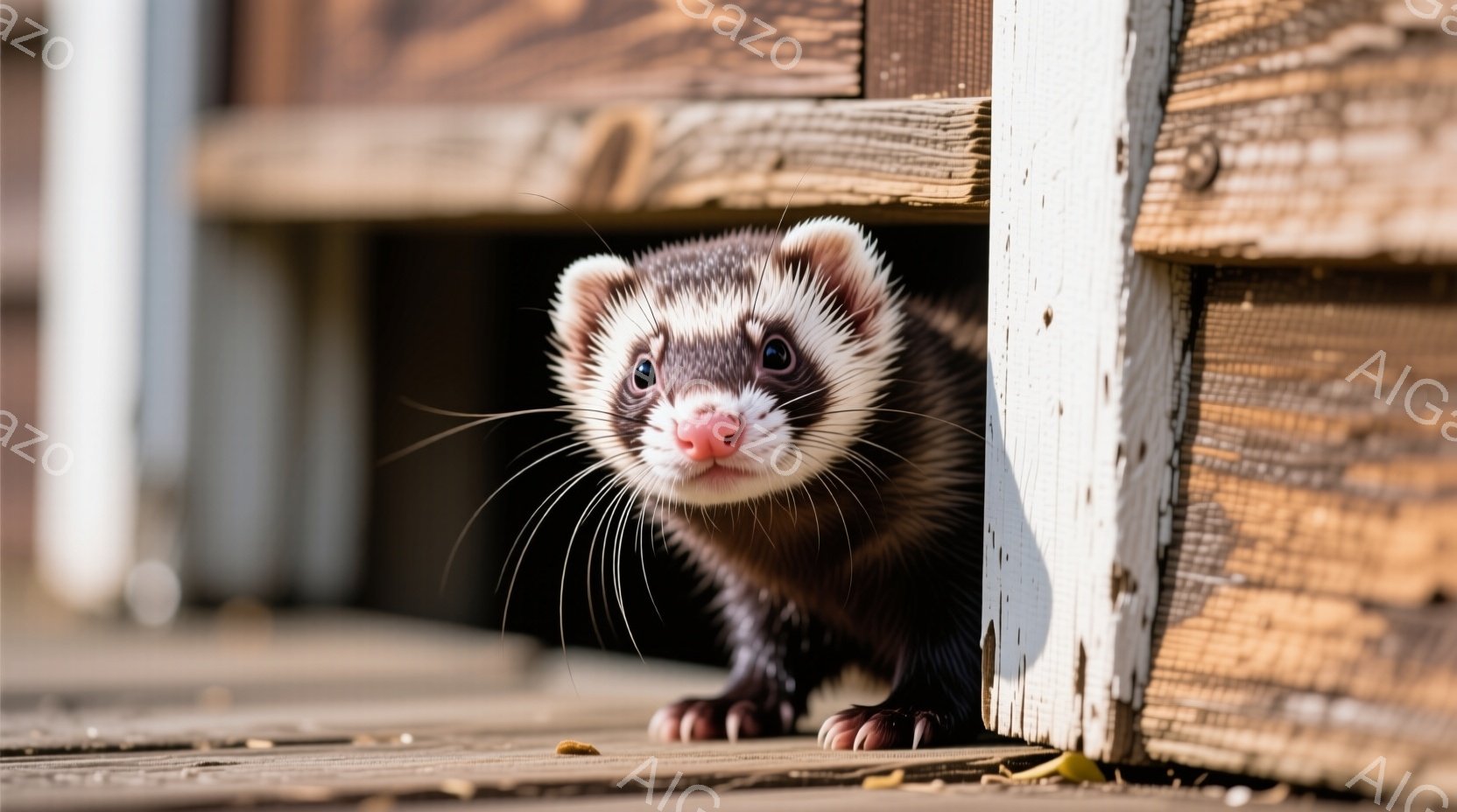 黒くて白い模様のフェレットが、木製の柵の隙間からこちらを見ています。つぶらな瞳とピンク色の鼻が可愛らしく、少し警戒したような表情をしています。背景は木製の柵が重なり合い、自然な光が差し込むことで、暖かく親しみやすい雰囲気を醸し出しています。