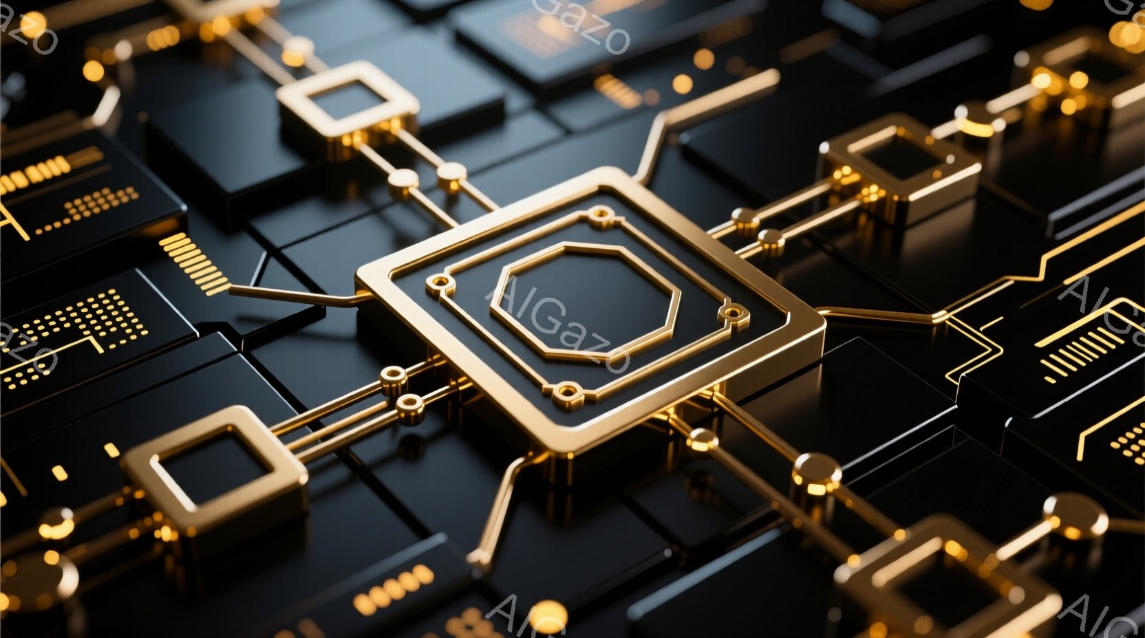 漆黒の背景に、金色の幾何学模様が複雑に組み合わされた構造体が広がっています。中心には八角形が内包された正方形が配置され、そこから放射状に金色の線が伸びています。全体的に未来的なテクノロジーや回路を連想させる、洗練された雰囲気を持っています。