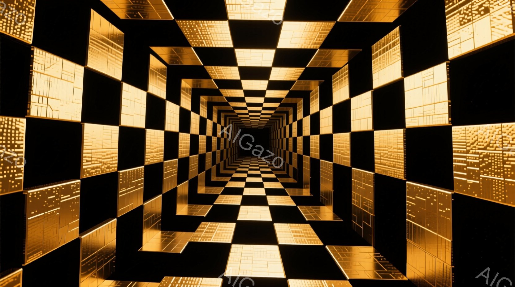 無限に続くかのような金色の立方体で構成されたトンネルが描かれています。各立方体には複雑な回路のような模様が刻まれ、光が反射して未来的な雰囲気を醸し出しています。暗闇の中に光るこの構造は、無限の可能性や深淵を連想させます。