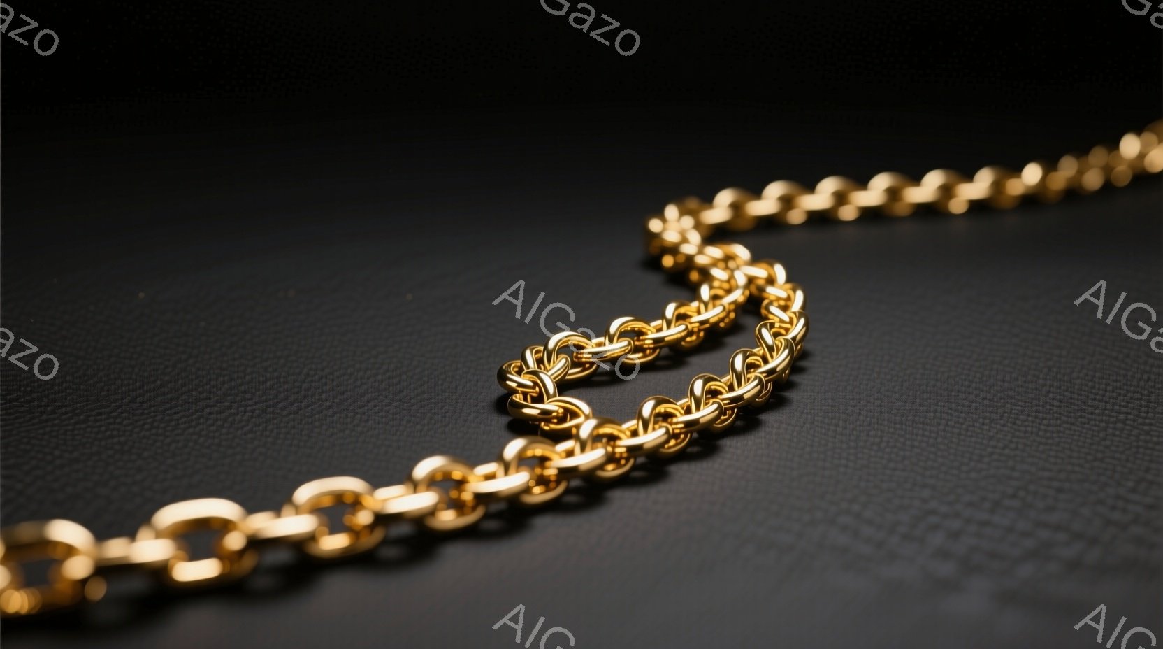 鮮やかな金色のチェーンが、暗い黒い背景に印象的に映えています。チェーンは複雑に絡み合い、光沢があり、高級感と重厚感を漂わせています。背景のテクスチャはわずかに粗く、チェーンの輝きをさらに際立たせています。