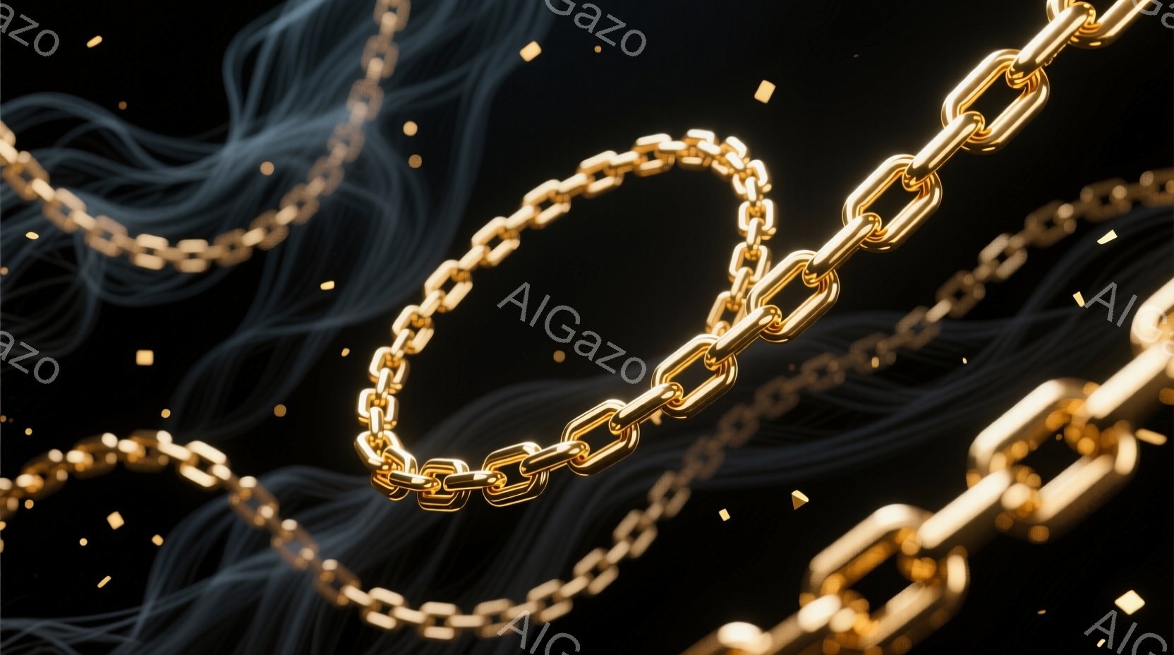 漆黒の背景に、金色のチェーンが空間を飛び交う様子が捉えられています。チェーンは光沢があり、まるで流動的なオブジェのようです。背景には抽象的な暗い模様がぼんやりと見え、チェーンの輝きを際立たせています。