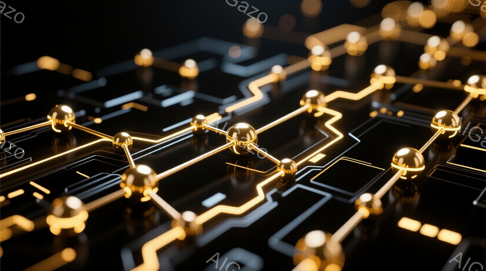 黒い背景に金色の回路が複雑に張り巡らされた画像です。金色の球体が回路の一部として配置され、光沢があり未来的な印象を与えます。回路線は精密で、テクノロジーや電子機器の内部構造を連想させるデザインです。
