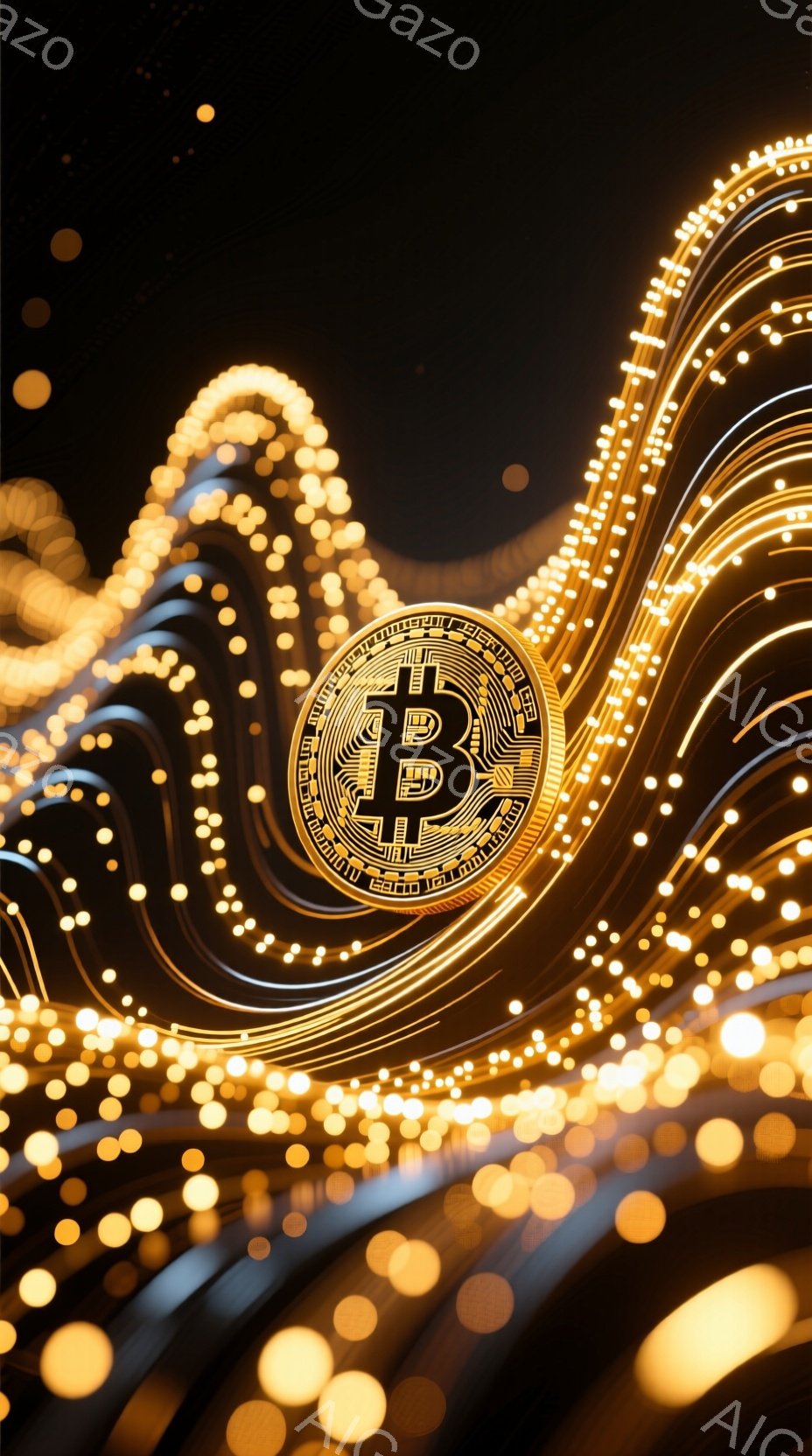 鮮やかな金色の光の粒子が渦巻き、流れるような曲線を描いています。その中心にはビットコインのロゴが配置されており、光の粒子がロゴを囲み、強調しています。全体として、流動的で未来的な印象を与える、ダイナミックで魅力的なビジュアルです。