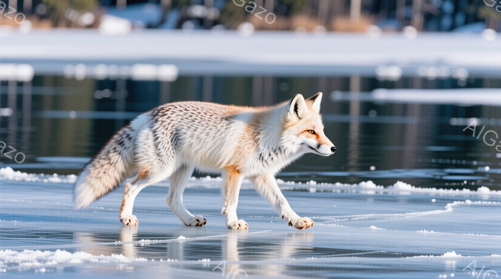凍った湖面を、赤褐色の毛並みのキツネが歩いている。その姿は凛々しく、鋭い眼差しは遠くを見つめているようだ。背景には、雪に覆われた植物とぼんやりとした景色が広がり、静かで寒々とした冬の雰囲気を醸し出している。