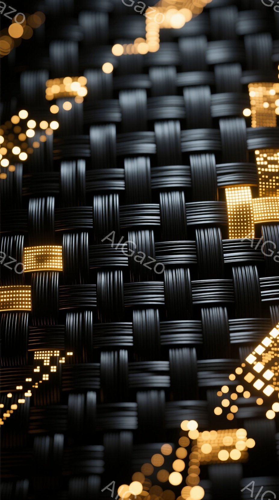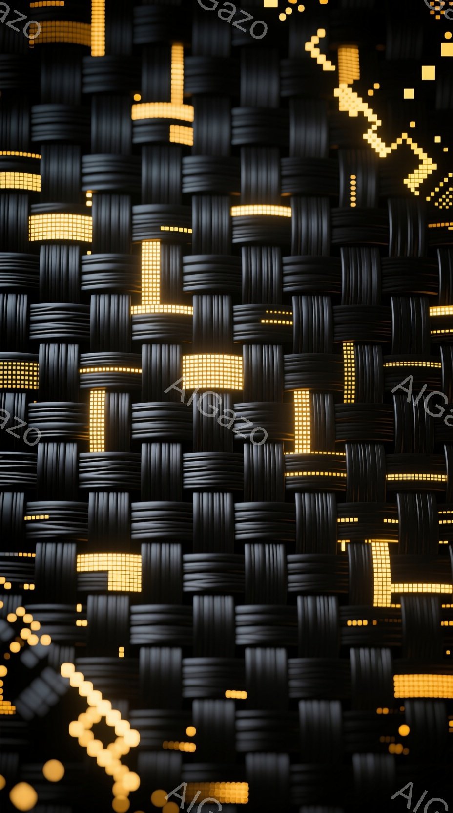 画像は、黒い織り目のようなテクスチャを背景に、金色の光のラインが幾何学的に配置された抽象的な表現です。光のラインは、水平、垂直、そして点線状に走り、まるで電気回路や未来的な都市の景観を想起させます。全体的に、モダンでテクノロジーを感じさせる、少し神秘的な雰囲気を持っています。