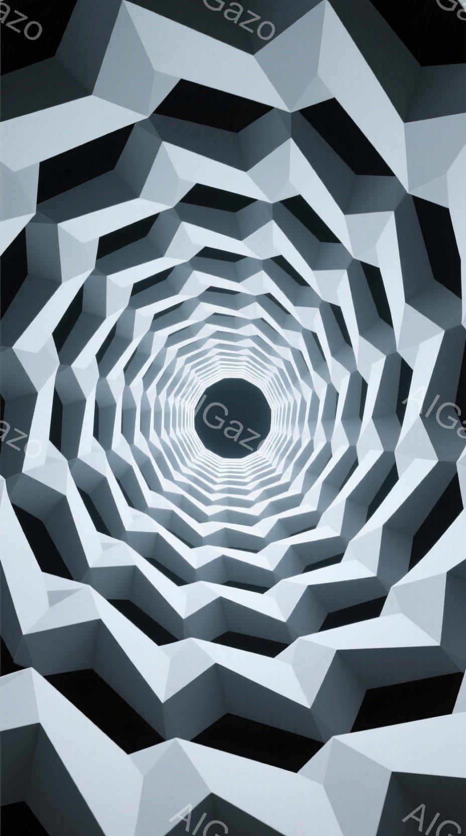 この画像は、中心に向かって収束する幾何学的なトンネルを描写しており、多角形の層が繰り返され、奥行きと無限の感覚を生み出しています。明るい水色と濃い灰色が交互に配置され、視覚的なリズムを作り出し、中央の暗い円は、まるで別の次元への入り口のようです。全体的に、未来的な抽象感と、引き込まれるような感覚を強く喚起するイメージです。