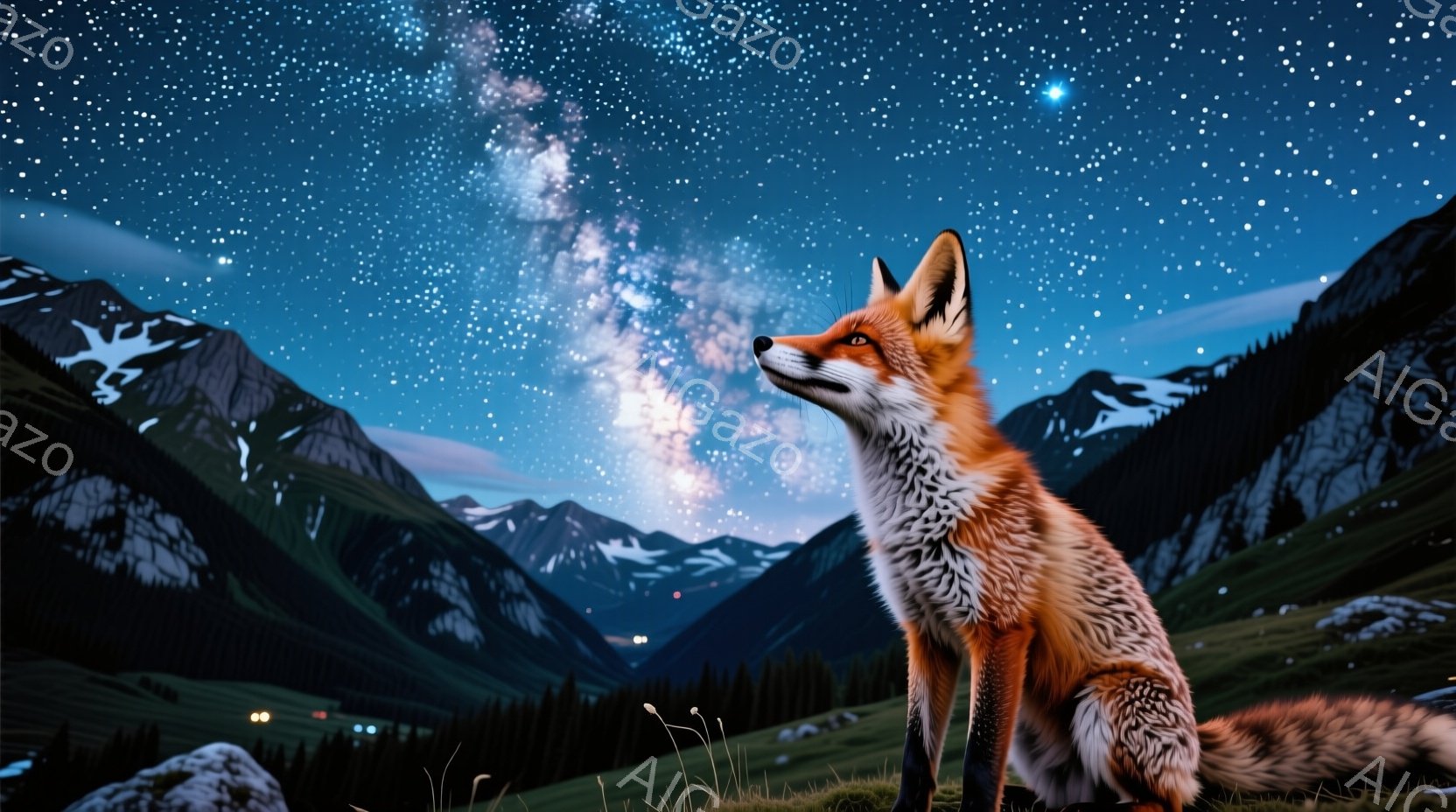 明るいオレンジ色の毛並みを持つキツネが、緑豊かな丘の上に座り、夜空を見上げている。背景には雪を頂いた山々が連なり、壮大な自然の風景が広がり、星空が輝いている。キツネは静かに、何かを待ち望んでいるかのような、穏やかで神秘的な雰囲気を醸し出している。
