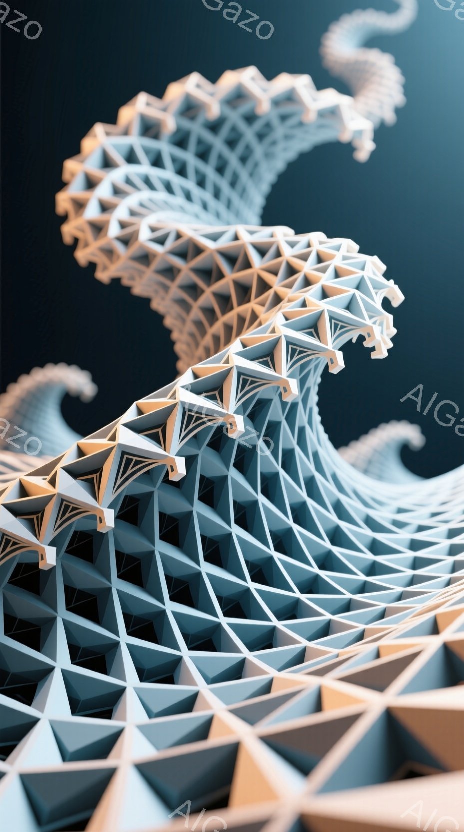 白く複雑な構造体が、うねるように曲線を描いて伸びています。その構造は、幾何学的な三角形のパターンが積み重なって構成され、まるで巨大な彫刻作品のようです。背景は深い青色で、構造体の白さを際立たせており、未来的な雰囲気を醸し出しています。
