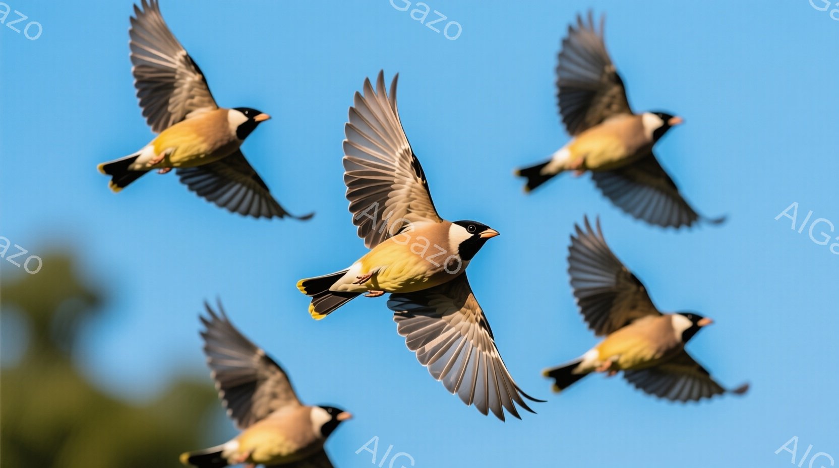 空を飛ぶ鳥たちが写っている。茶色、黒、白、黄色を基調とした美しい羽毛を持ち、翼を大きく広げて活発に飛び回っている。背景は晴れた青空で、鳥たちの躍動感と自由な雰囲気を強調している。
