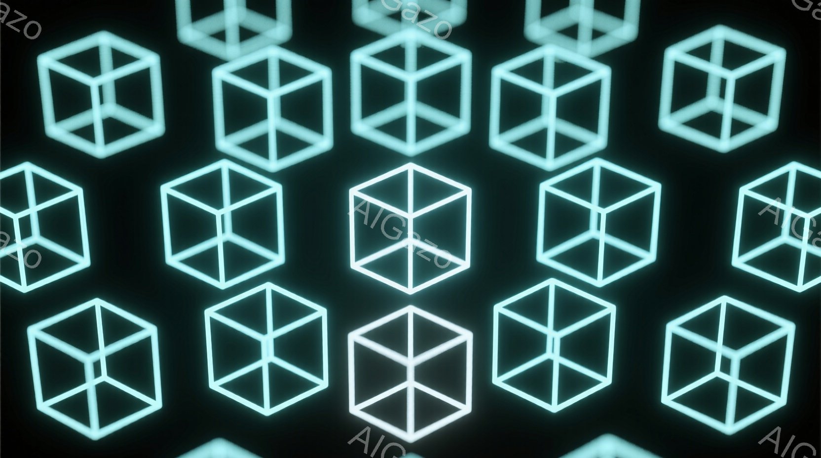 画像は、暗い背景に浮かび上がる、発光する白線で描かれた複数の立方体が並んだ様子を示しています。立方体は均等な間隔で配置され、まるで空間に散らばる光の粒子のような印象を与えます。全体的に未来的で神秘的な雰囲気があり、サイバーパンク風のビジュアルを想起させます。