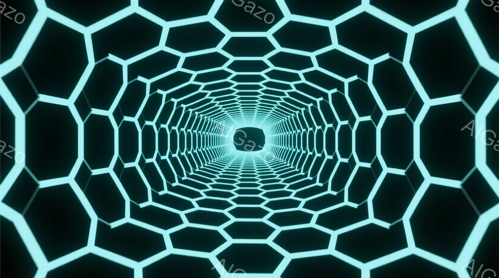 この画像は、六角形が無限に続くトンネルのような空間を描写している。暗い背景に、明るい六角形が規則的に並び、遠近感によって奥へと吸い込まれるような視覚効果を生み出している。全体的に神秘的で未来的な雰囲気を醸し出しており、無限の空間やデジタル世界のイメージを想起させる。