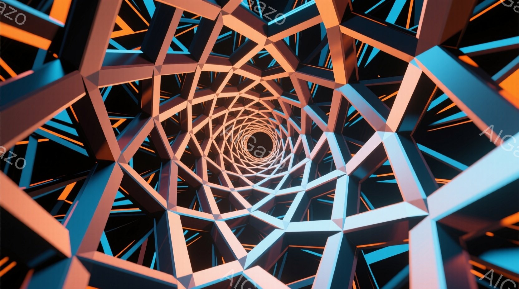 この画像は、幾何学的な構造が複雑に絡み合い、渦巻くようなトンネルを描いています。白いポリゴンの構造が無限に続くように見え、中央に向かって収束する視覚的な効果を生み出しています。全体的に、未来的な抽象芸術作品のような雰囲気で、奥行きと無限の可能性を感じさせます。