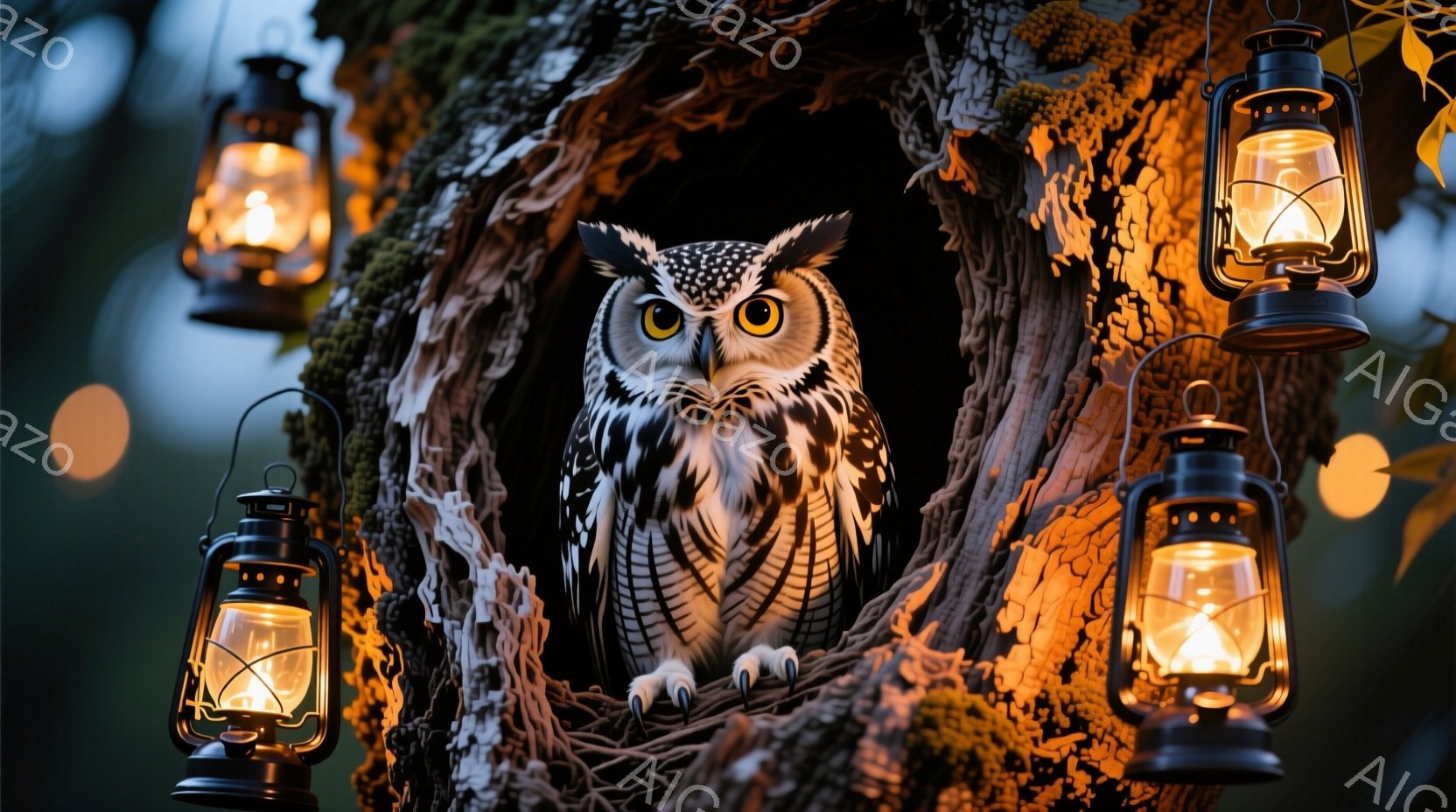 深い森の中の古木のくぼみに、大きなフクロウが落ち着いた様子で座っている。周囲には点灯したランタンが配置され、フクロウの羽毛と暗い木肌を照らし、神秘的な雰囲気を醸し出している。ランタンの光とフクロウの鋭い視線が、静寂の中に緊張感をもたらしている。